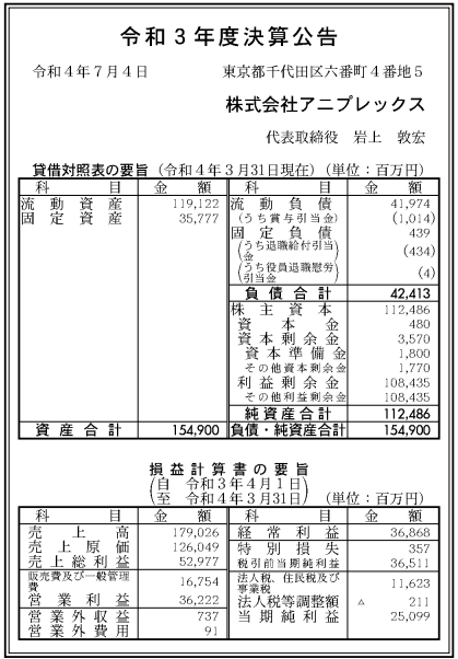 アニプレックス 令和3年度決算